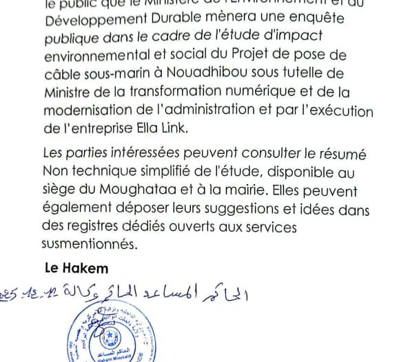 يرفع حاكم مقاطعة نواذيب إلى علم الجمهور أن وزارة البيئة التنمية المستدامة ستجري استقصاء عموميا في إطار دراسة تقييم الأثر البيئي والإجتماعي لمشروع مد كابل بحري دولي يصل إلى نواذيب لصالح وزارة التحول الرقمي وعصرنة الإدارة وبتنفيذ شركة ELLA LINK . وفي هذا السياق يمكن للأشخاص المهتمين بالموضوع …