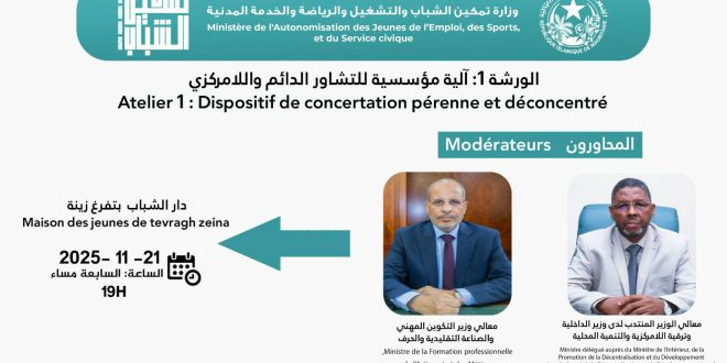 أعلنت وزارة تمكين الشباب والتشغيل والرياضة والخدمة المدنية، اليوم، عن تنظيم ثلاث ورشات تحضيرية متزامنة، استعدادًا لحفل اختتام المؤتمر الوطني لتمكين الشباب، وذلك يوم 21 نوفمبر 2025 عند الساعة السابعة مساءً، في دور الشباب بولايات نواكشوط الثلاث.